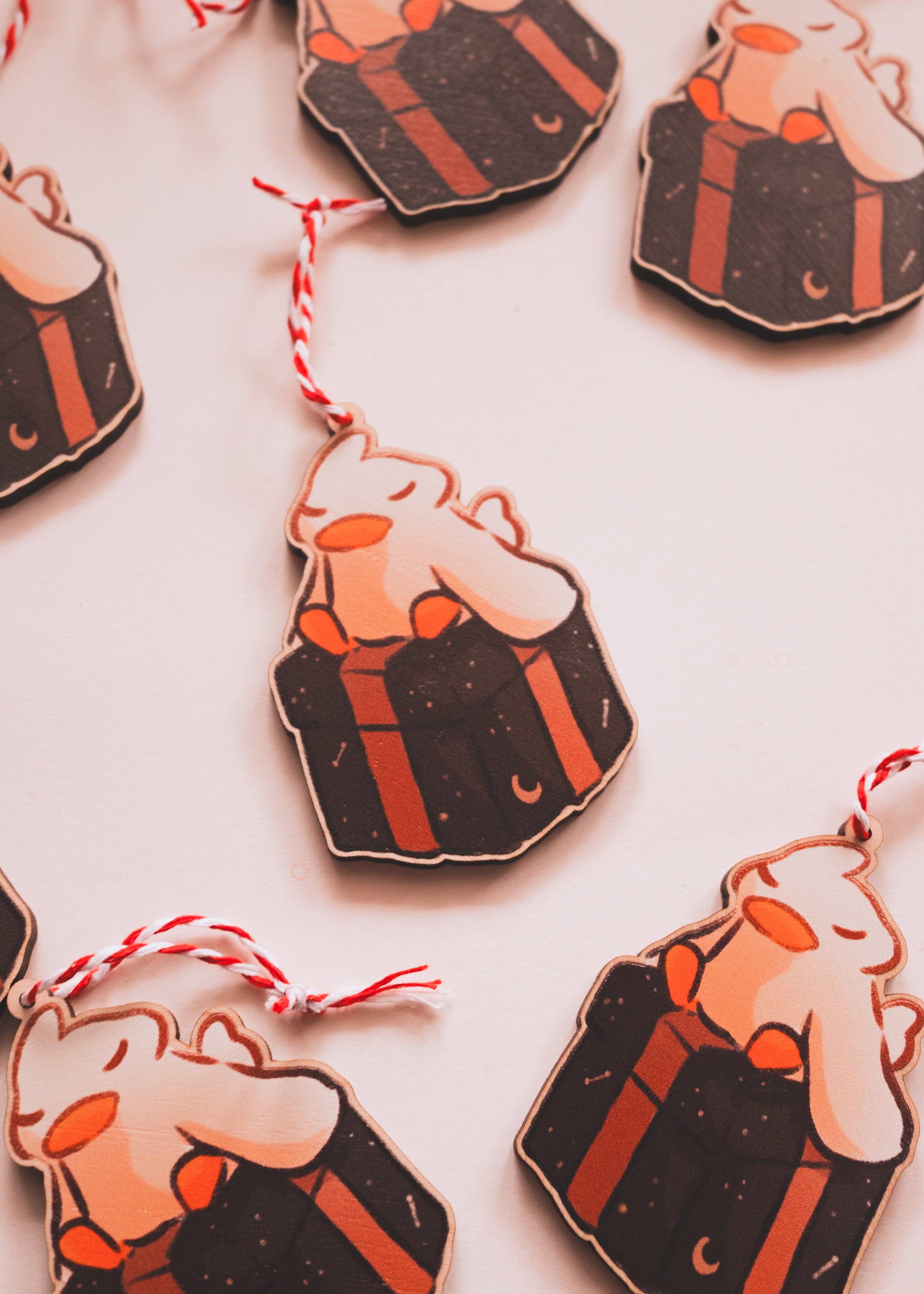 Ornement en bois pour sapin - 6.5cm. Petite corde rouge et blanche